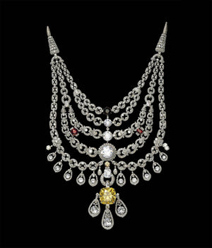The Maharaja of Patiala was the ruler of the princely state of Patiala, in British India. In the late 1920’s he sent a chest of gems to The House of Cartier in Paris, with a request to make his crown jewels. Included in the gems was a 234 Carat yellow octahedral De Beers diamond that had been found in the De Beers mines in the late 19 th century. It weighed 426 carats in its uncut form and was bought by Maharaja Patiala in an auction in Paris. The iconic Collier de Patiala was created by the House of Cartier and presented to him in 1928. It remains one of the most extravagant pieces ever created and the largest single commission that Cartier ever executed.
